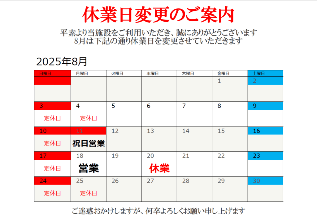 8月は上記の通り、休業日の変更がございます。